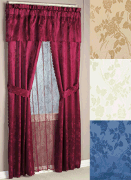 Now you can easily redecorate your home without spending a fortune or hiring a professional decorator. The secret? These lovely jacquard curtains have 2 side panels, a scalloped valance and a lace back panel that are all attached so they hang from one standard curtain rod. Tiebacks included. Imported in machine-washable polyester. Set Includes: